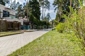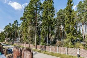 Поселок окружен лесом с величественными соснами, что создает атмосферу уединения и спокойствия, идеально подходя для загородной жизни.