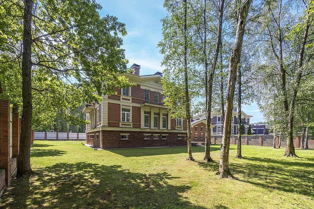 Дом площадь 1 100 м² (2 этажа + гараж). Расположен на участок 23 сотки (2 300 м²) с газоном и прилесным расположением. Английская архитектура с краснокирпичным фасадом, рустовкой и колонным портиком.