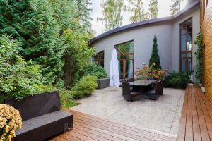 На просторном участке площадью 44 сотки оборудованы зоны отдыха, выполнен ландшафтный дизайн - высажены декоративные деревья и кустарники, разбиты клумбы и проложены прогулочные дорожки. Так же на участке растут лесные деревья, ели и сосны. Дополнительно на территории оборудован навес на 2 автомобиля.