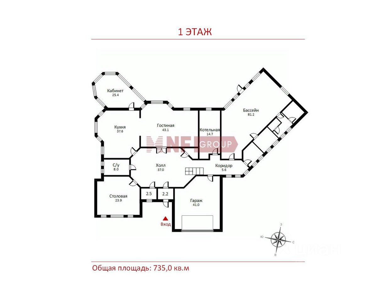 1 этаж: холл, гардеробная, кабинет, с/у, кухня с выходом на теплую крытую террасу, каминный зал, бассейн с противотоком, сауна, душевая, с/у, хоз.комната, бойлерная, гараж на 2 м/м.