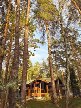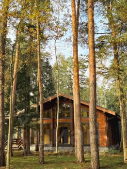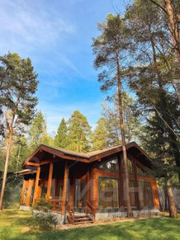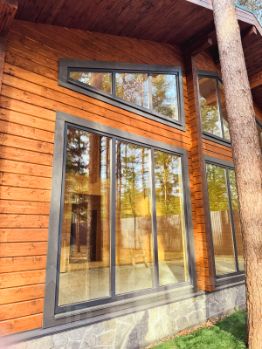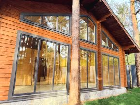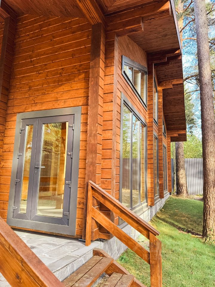 Новый жилой дом в стиле шале, общей площадью 255 кв. м. Клееный брус, бетонный монолитный фундамент ,кровля мягкая черепица, панорамные окна, ламинированные стеклопакеты, мансардные окна, широкая двойная входная дверь.