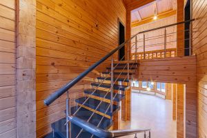 Монолитная плита, клеённый брус из ангарской сосны, клеённые балки перекрытия, деревянные окна, черепица Braas.