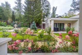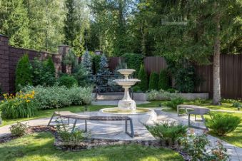 На участке выполнен прекрасный ландшафтный дизайн- взрослые деревья, декоративные кустарники, розарий, а в центре зоны отдыха расположен красивый фонтан.