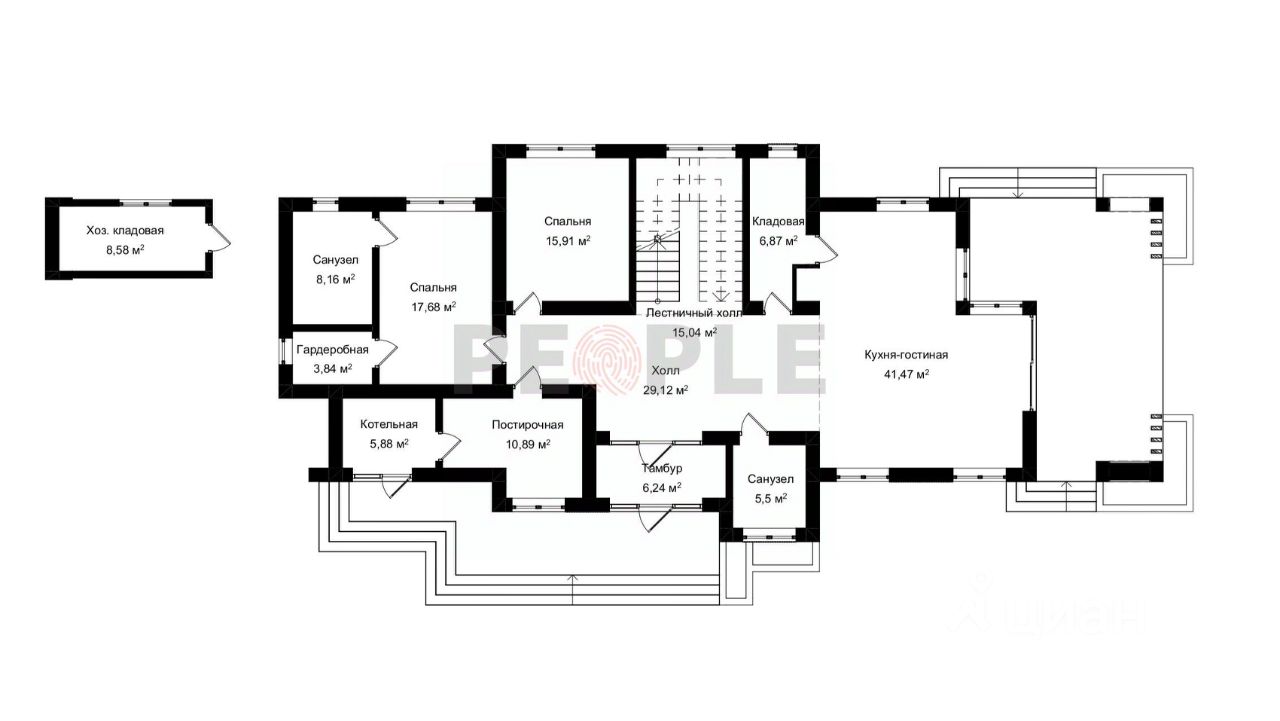 открытую террасу, холл, спальня с с/узлом и гардеробной, кабинет, техничекиепомещения и котельная.
