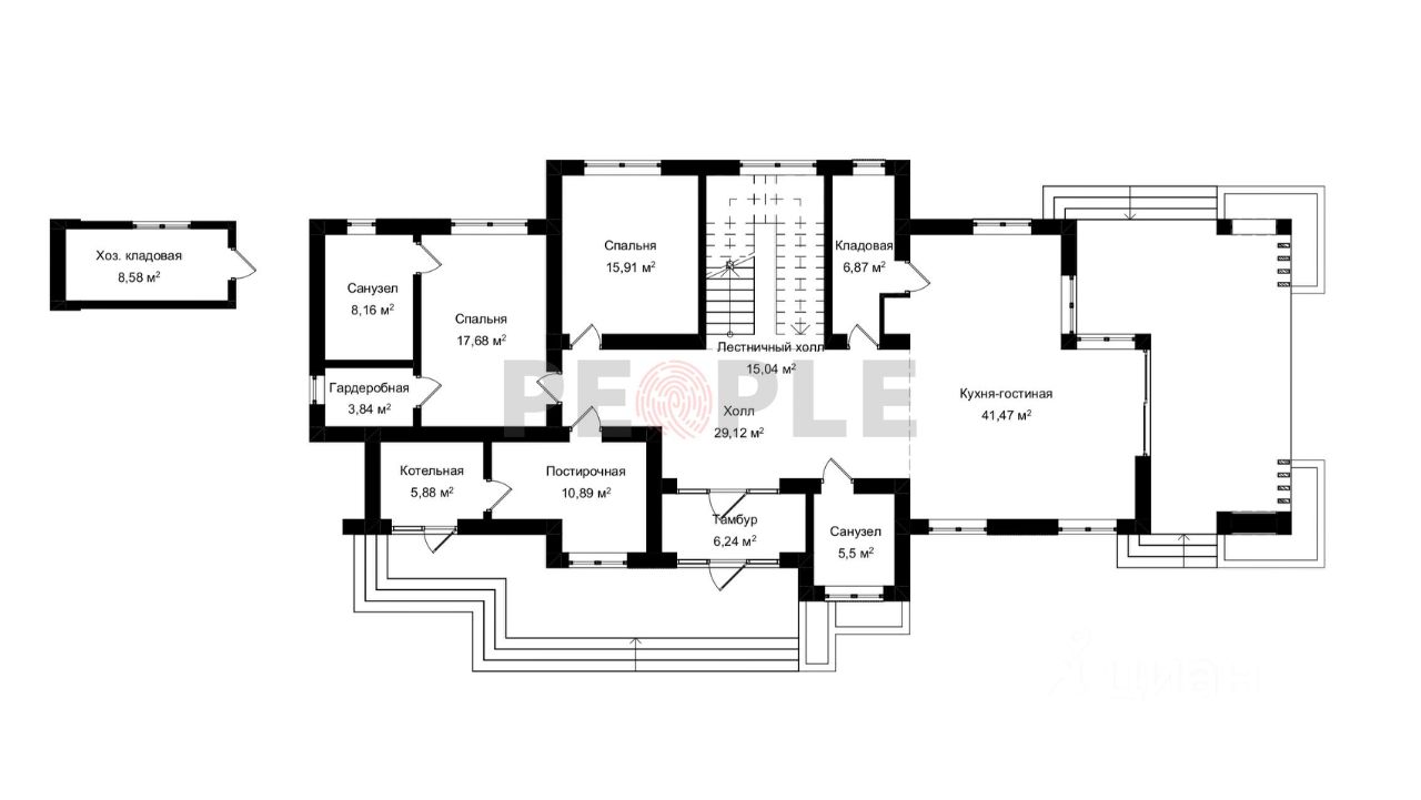 открытую террасу, холл, спальня с с/узлом и гардеробной, кабинет, технические помещения и котельная.