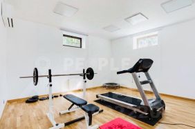 В цокольном этаже оборудованны тренажерный зал, музыкальная студия, винная комната из дуба на 1500 бутылок, кладовые и подсобные помещения, санузел, отдельный вход для обсуживающего персонала.