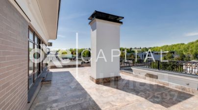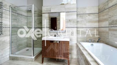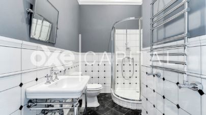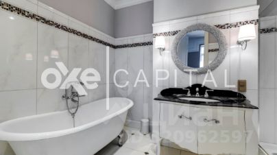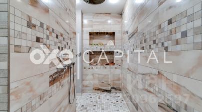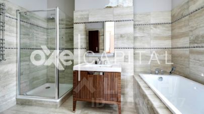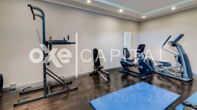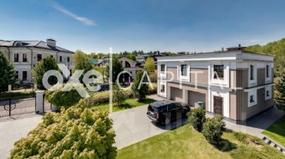 На участке еще находится дом с гаражем на 2 машины и квартирой для персонала площадью 200 кв. м. Коммуникации все центральные, в комнатах установлена система кондиционирования, есть резервный генератор электричества. Цоколь: спа зона с сауной, душевой, массажной, санузлом, комнатой отдыха. Также есть спортзал с тренажерами, а также гардеробная, электрощитовая, кладовая, постирочная, еще один санузел. 1 этаж: гардеробная при входе, холл с красивой мраморной лестницей, обрамленной художественной ковкой, гостиная с камином, столовая, 2 кухни, спальня со своим санузлом, 2 санузла, дополнительный вход ближе к кухне, через который удобно приносить продукты. 2 этаж: практически в каждой из пяти спален есть своя гардеробная комната и свой санузел. 3 этаж: гостиная с панорамными окнами и камином, есть санузел и выход на эксплуатируемую кровлю. Гараж: отдельностоящий 2 м/м.