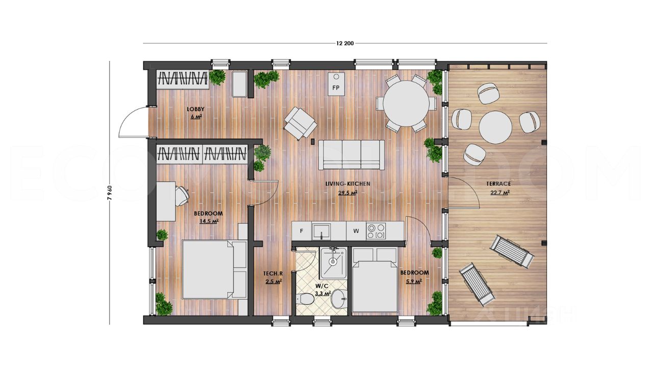 Плюс веранда в 20 квадратов, по вашему желанию вы можете поставить мягкие окна и сделать веранду теплой