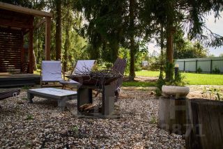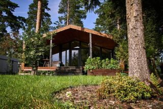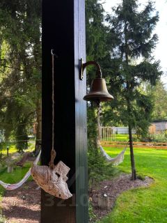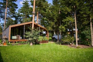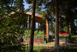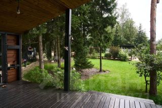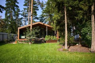 Участок благоустроен дорожками, зоной газона и засажен яблонями и другими декоративными растениями. На участке растут вековые сосны.