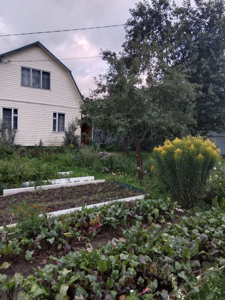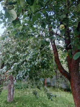 Участок правильной прямоугольной формы, сухой с плодовыми деревьями (яблони, слива, вишня), кустарниками (черная, красная смородина, крыжовник). Есть клубника, цветник.