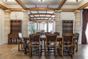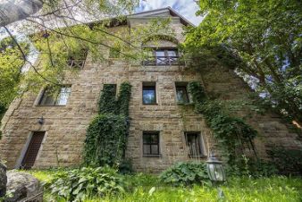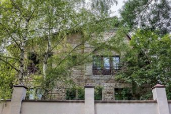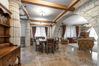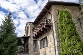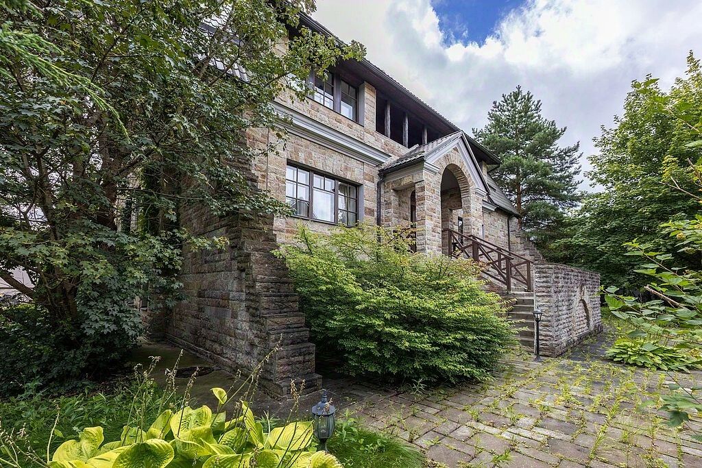 Фасад дома изысканно украшен высококачественным натуральным камнем, подчёркивая уникальность и солидность архитектуры.