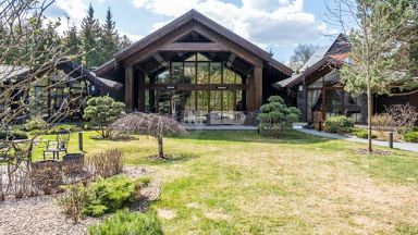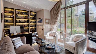 Основной дом (650 кв.м.) предлагает на первом этаже великолепную СПА-зону с сауной и хамамом, а также просторную зону отдыха с камином, массажными креслами и кинозалом. Из основного дома можно перейти в дом-шале, где расположены гостиная, кабинет, большая профессиональная кухня-барбекю с залом для гостей. На участке также находится дом для персонала (80 кв.м). Гараж в контуре дома предоставляет 2 парковочных места.