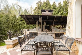Банный комплекс также включает просторную комнату отдыха с дровяным камином и собственной кухней.