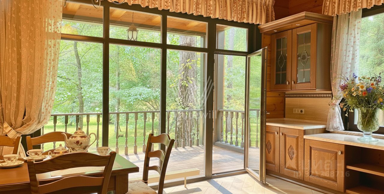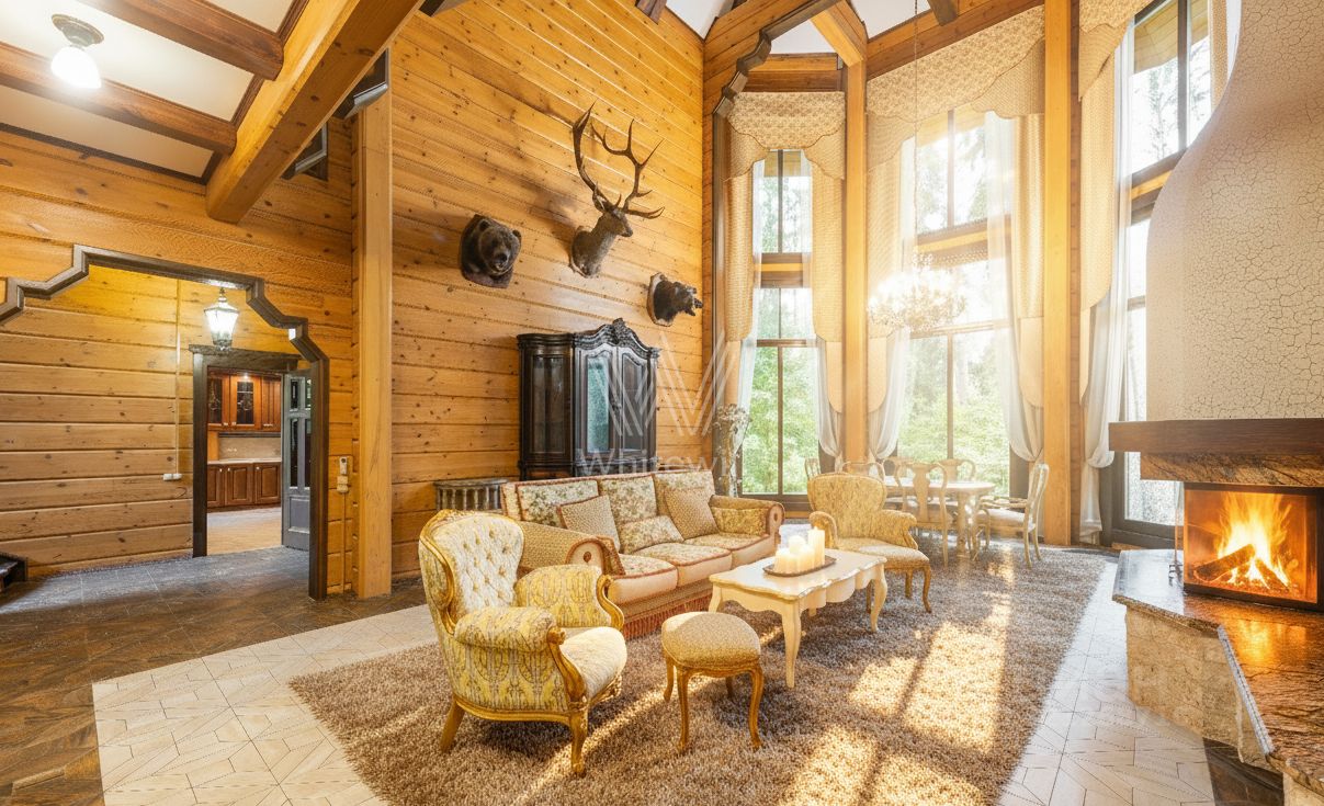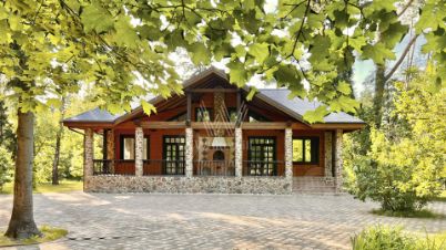 Успенские дачи. Дом площадью 359 м² расположен в живописном посёлке с доступом к пруду на малой реке-притоке р. Москвы, на участке в реликтовом сосновом лесу, площадью более гектара, с фруктовым садом. Главный дом возведён из клеёного бруса, а фасад с панорамными окнами и выразительным эркером подчёркивает характер архитектуры. Центральная часть интерьера — гостиная со вторым светом и потолками до 11-ти метров, дополненная эксклюзивным камином. Окна выполнены из дерева с энергосберегающими стеклопакетами и немецкой фурнитурой, двери изготовлены из массива дуба по индивидуальному заказу.