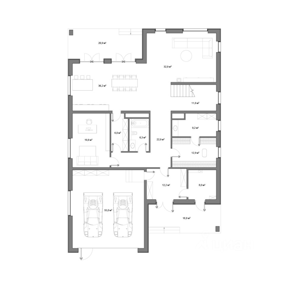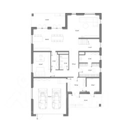 Планировка дома позволяет сосредоточить все функциональные и рабочие зоны на первом этаже: здесь предусмотрены большая гардеробная комната, постирочная, кухня со столовой и кладовой, атакже кабинет. Из гаража, рассчитанного на две машины, вы проходите сразу в холл дома.
