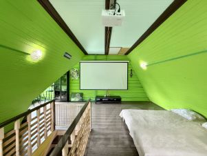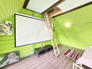 Третий этаж это большая спальня на всю площадь этажа. С рабочей зоной, домашним кинотеатром и выходом на балкон.