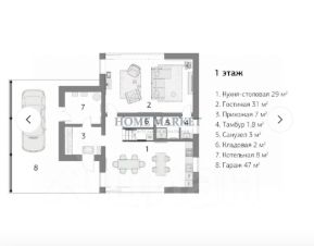 Первый этаж: кухня- столовая, гостиная, холл, гостевая спальня, с/у, хамам, котельная, 2 кладовки, гараж, 2 террасы.