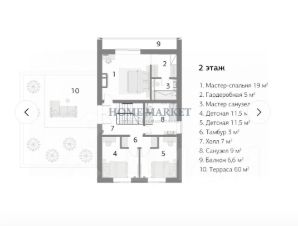 Второй этаж: мастер спальня с гардеробной комнатой и с/у, 2 детские комнаты, с/у, кабинет, балкон.