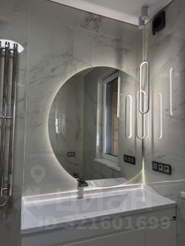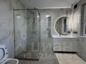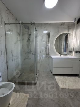 С/У, в широкофоратном керамограните под мрамор, душевая кабина, умывальник с зеркалом, туалет.