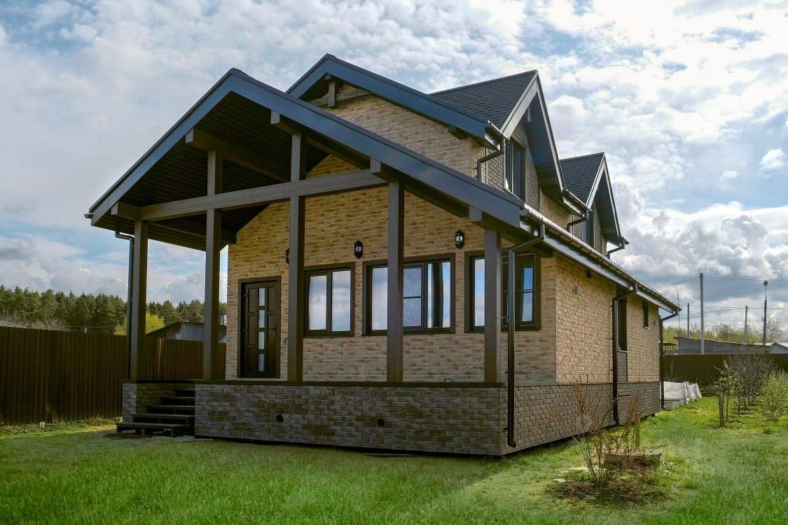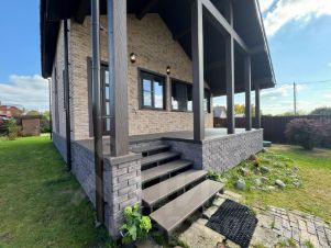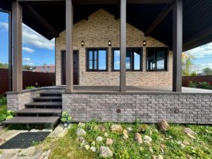 —внешняя отделка фасадной плиткой Каньон Конаковский (цоколь и фасады) с декоративными балками под кровлей; терраса — фиброцементным сайдингом Cedral Wood и террасной доской. Выполнена архитектурная подсветка фасадов.