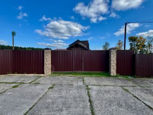 —забор из профлиста, откатные ворота 4,85 м, въездная группа выложена дорожными плитами. Забор по всему периметру участка.