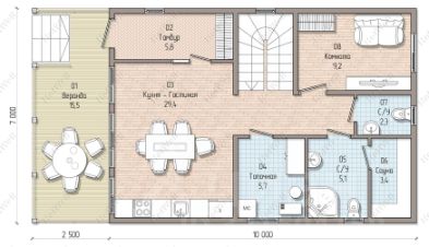 1 этаж: просторная кухня-гостиная, изолированная комната, техническая комната — котельная, 2 санузла, сауна, прихожая, терраса;
