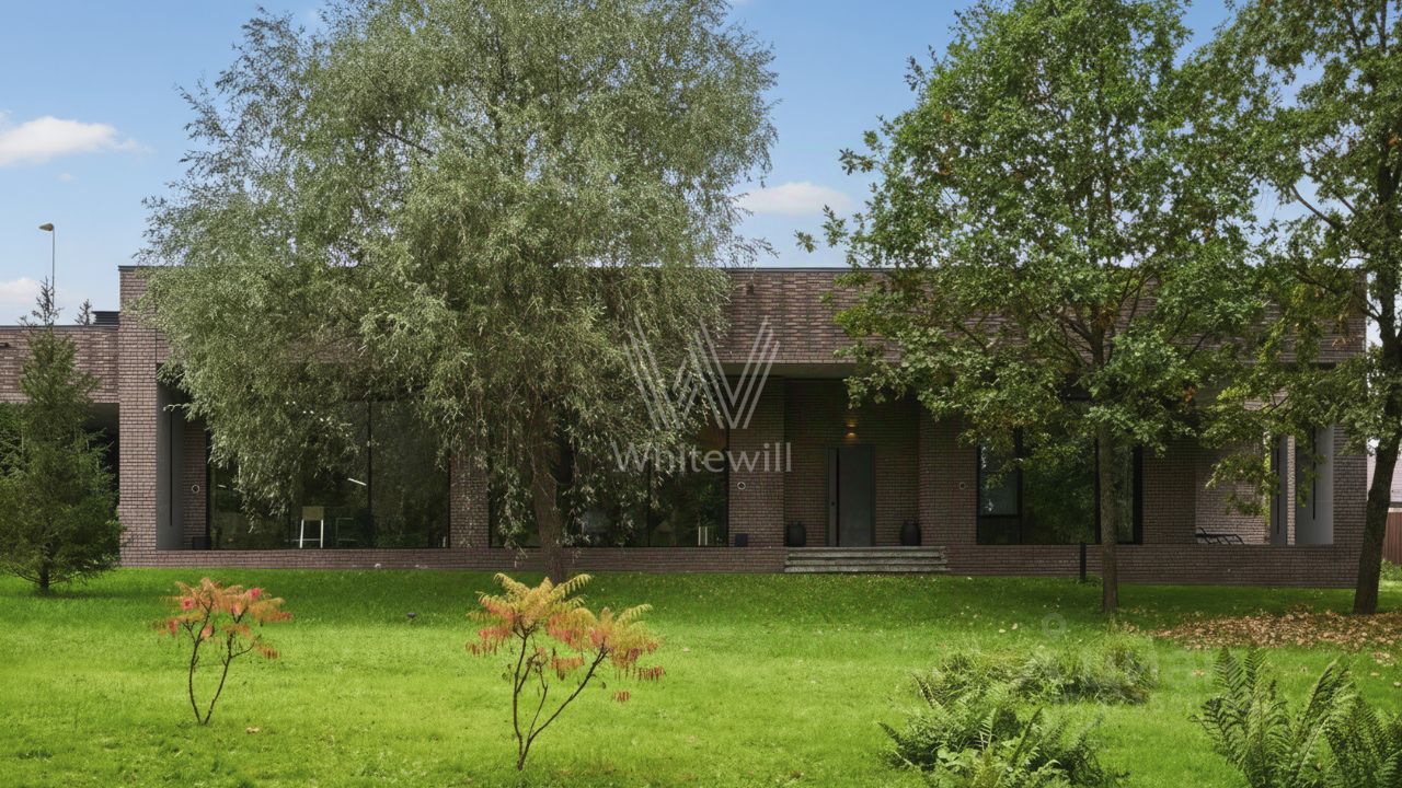 Зелёная роща-1. Новый загородный коттедж площадью 500 м² расположен на просторном полевом участке 42,5 сотки в тихой части посёлка. Современный фасад гармонично вписан в ландшафт, облицован клинкерным кирпичом и дополнен подсветкой, эффектно подчеркивающей строгие линии здания в вечернее время.