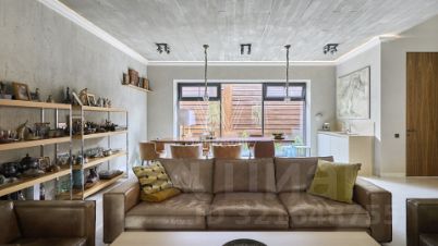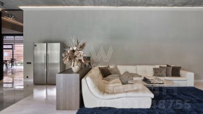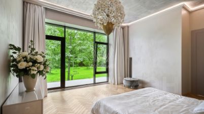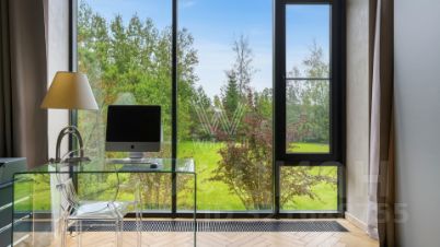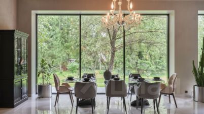 Панорамные окна с алюминиевым профилем стирают грань между природным окружением и внутренним пространством, наполняя его солнечными лучами. Интерьеры выдержаны в светлых тонах, а также дополнены изящными светильниками и элементами с фактурой бетона, отсылающими к стилю лофт. Дом полностью укомплектован комфортной мебелью и встроенной бытовой техникой.