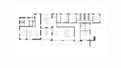 Холл, гостиная-кухня-столовая, зона отдыха, терраса, мастер-спальня с гардеробной и санузлом, 3 спальни с санузлами, 2 гардеробные, постирочная, гараж с санузлом, котельная, квартира для персонала с кухней, спальней и санузлом.