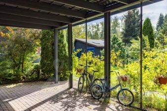 К дому примыкает просторная, частично крытая терраса (50 м2), с зоной-барбекю и релакс-пространством с гидромассажным спа. Терраса соединяет основной дом с гостевым домом-мастерской, стильным и функциональным строением (40 м2), где логично расположились сразу несколько зон: мастерская, зона отдыха/кинозал, спа с сауной и душевой, спальная зона.