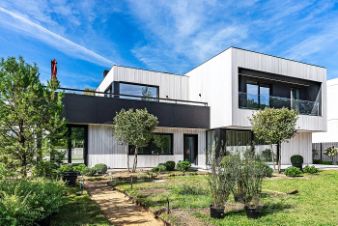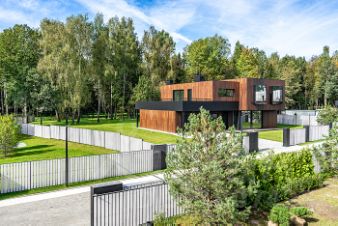 - В отделке фасада использованы отделочные материалы из натуральной древесины - лиственницы, установлена архитектурная подсветка.
