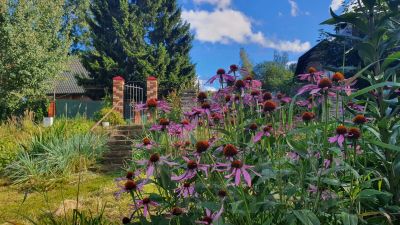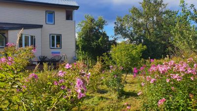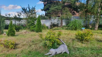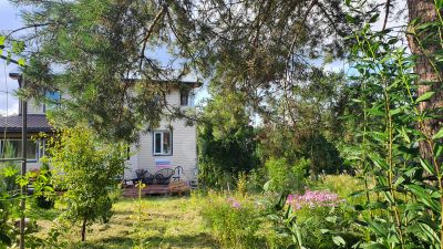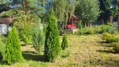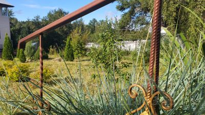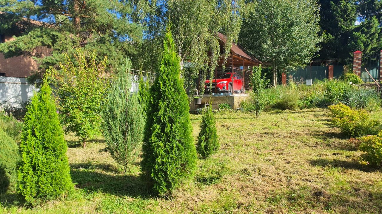 Очень красивый просторный участок, сделан ландшафтный дизайн, небольшой уклон. Благодаря чему с участка открывается потрясающий вид, никакой зажатости заборами и соседями, как в других "плоских" СНТ, с 6-соточными участочками.