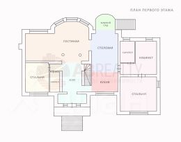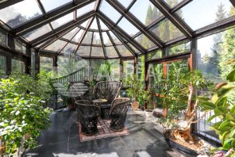 На 1 этаже просторная гостиная с камином, столовая с выходом в зимний сад, кухня, гостевая спальня с санузлом, детская спальня с кабинетом и санузлом.