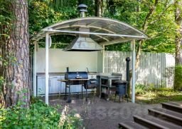 - Профессионально выполненный ландшафтный дизайн с сохранёнными хвойными деревьями.