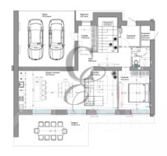 1 этаж: Просторная гостиная и кухня-столовая с выходом на террасу, гостевая спальня, тамбур/гардеробная с парадным входом в дом и из гаража, с/у первого этажа, котельная, теплый гараж на 2 мм, кладовая для садового инвентаря.