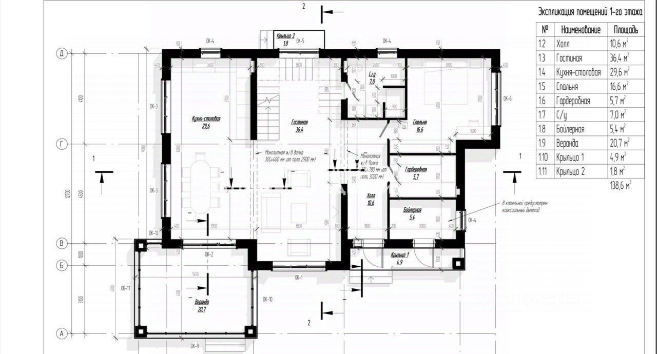 Первый этаж: прихожая, гардеробная, кухня-столовая с выходом на веранду, просторная гостинная, спальня, санузел, котельная имеет отдельный вход.
