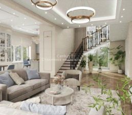 В доме реализована современная планировка, высокие потолки, панорамные окна из которых открывается прекрасный вид. На первом этаже большая кухня/гостиная с выходом на веранду.