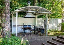 - Профессионально выполненный ландшафтный дизайн с сохранёнными хвойными деревьями.