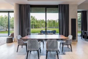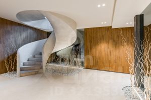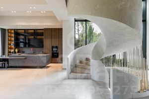 Интерьер: открытые и приватные пространства, натуральные материалы, декоративная штукатурка, панорамные окна на внутренний двор с ландшафтом.