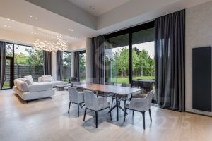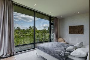 В доме: 4 спальни с ванными и гардеробными, гостиная-столовая, кухня, хобби-комната 50 м², двухуровневая спа-зона с хаммамом, сауной и джакузи, гараж на 2 машины с зарядкой для электромобиля, котельная, блок персонала с профессиональной кухней.