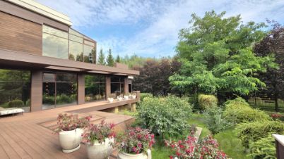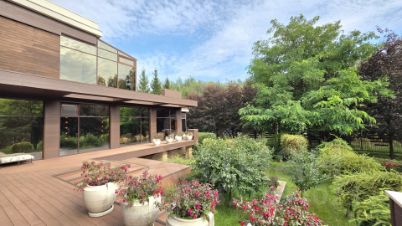 Ухоженный участок 30 соток одной стороной граничит с лесом. На нем: ели, по всему периметру посажены красные клены, японские лиственницы, вишни. Красивый газон, многолетние цветы, выложены дорожки из тротуарной плитки, у выезда обустроена площадка для парковки автомобилей.