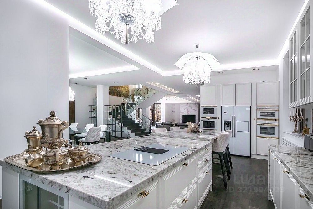 На кухне столешница из роскошного мрамора Bianco Azulado (Бразилия). Бытовая техника: холодильник French Door флагманской серии BOSCH; кофемашина, пароварка, микроволновая печь Kppersbusch (Германия); варочная панель Elica NIKOLATESLA LIBRA (Италия); посудомоечная машина ASKO (Швеция); стиральная и сушильная - Miele.
