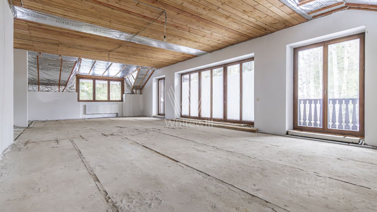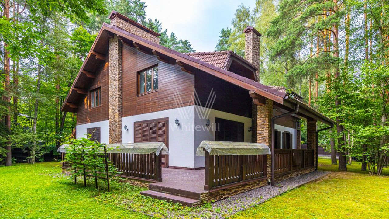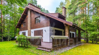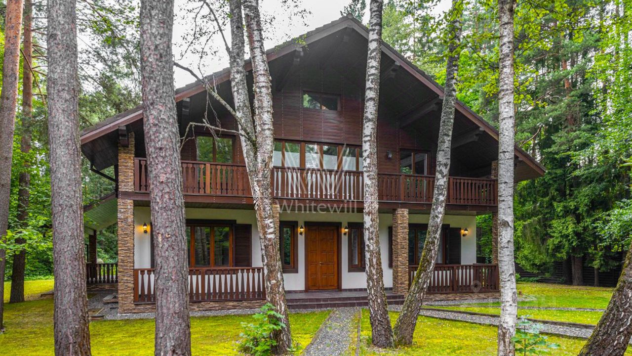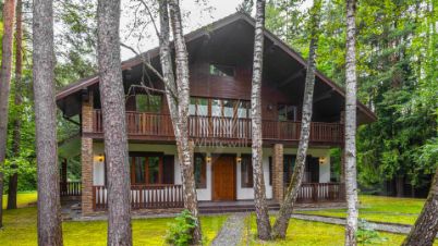 Новодарьино РАН. Загородный дом площадью 640 м² построен на лесном участке 24 сотки. Лаконичный фасад демонстрирует элементы шале и облицован деревом, камнем и декоративной штукатуркой. Коттедж представлен без отделки и со свободной планировкой, что позволяет реализовать индивидуальный дизайн-проект. На участке с березами и хвойными деревьями посеян газон и вымощены дорожки. Здесь можно обустроить места для отдыха и установить беседку с зоной для барбекю.