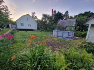 Участок солнечный, ухоженный, 8 соток. на участке расположена баня и гараж, а также зозпостройка, все грамотно и эргономично спланировано! На вьезде растет ароматная сирень и чебушник (очень похож на жасмин ароматом). 50% участка засеяно газоном, растут плодоносящие деревья: яблони, сливы и вишни. Есть небольшие грядки с клубникой и ежемалиной. Красная и черная смородина, малина, крыжовник. Цветы: пионы, розы, люпины, тюльпаны.