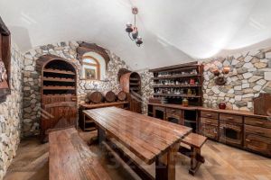 Цокольный этаж: Винную комнату, бильярдную, комнаты для настольного тенниса и тренажерного зала, санузел с душевой, помещение для обслуживания бассейна с фильтрацией воды, котельную, 4 кладовые и постирочную.