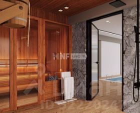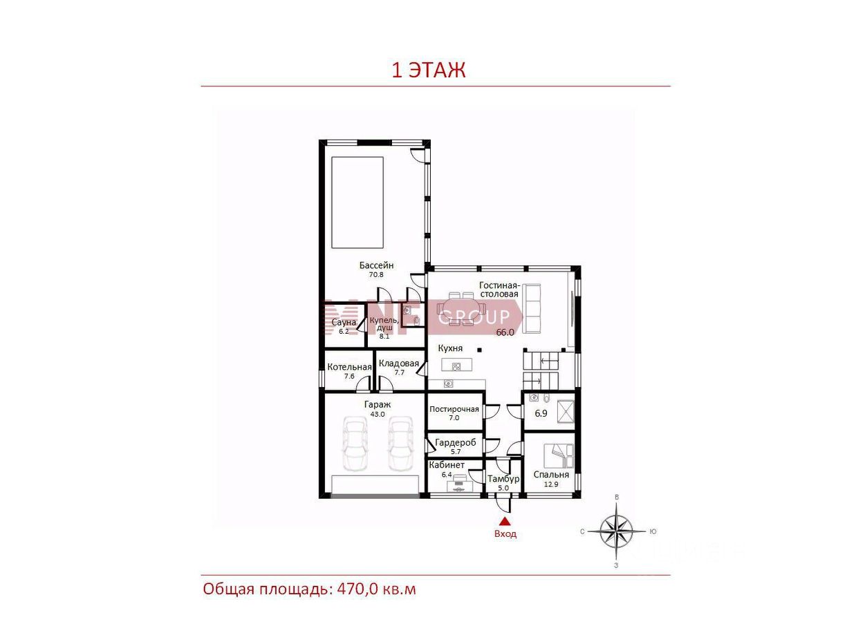 1 этаж: прихожая, гардеробная, с/у, постирочная, кабинет, спальня, холл, кухня, гостиная-столовая, кладовая, СПА-зона: купель с душевой, сауна, с/у, бассейн, котельная, гараж на 2 м/м;