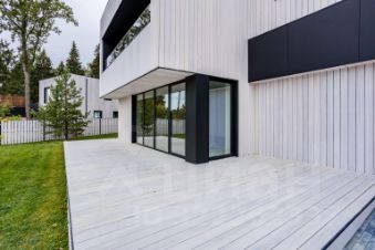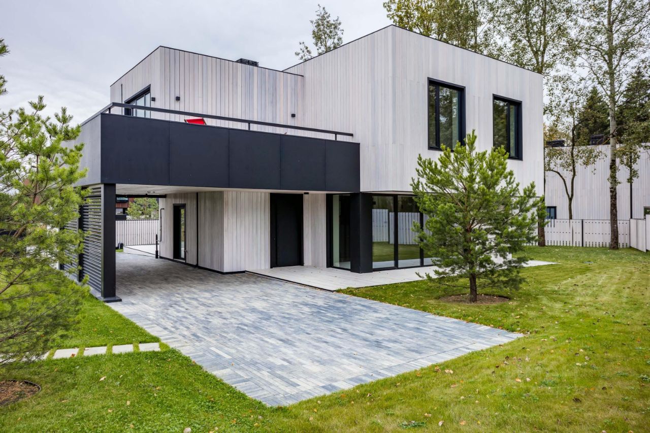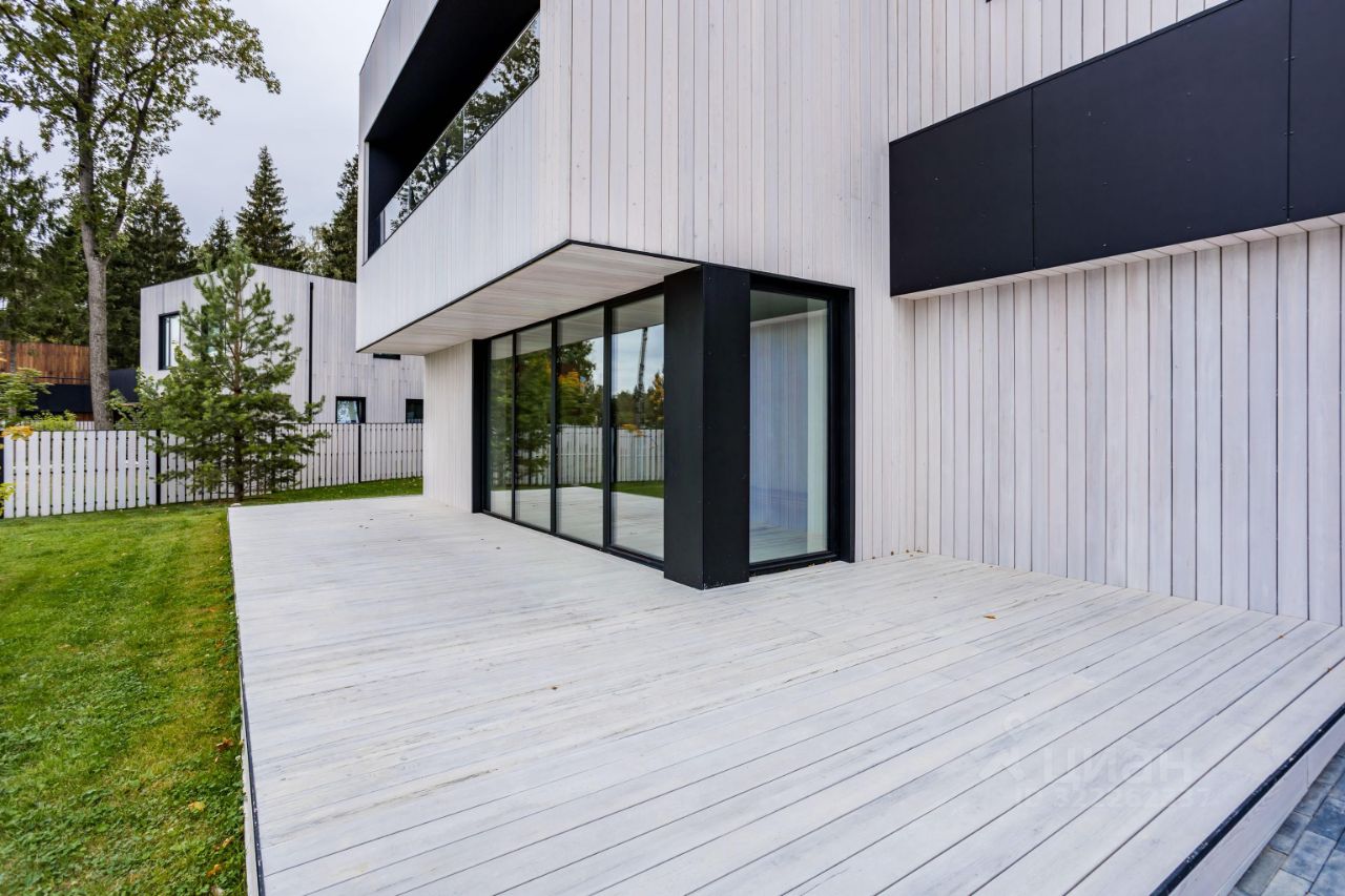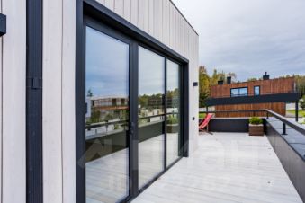 - Архитектурный шедевр — фасад из лиственницы, плоская кровля, стеклянные эркеры и террасы 32 м².