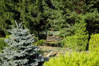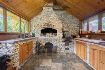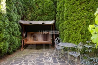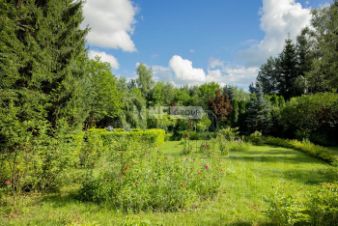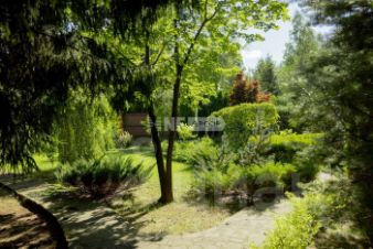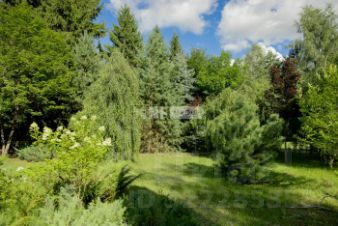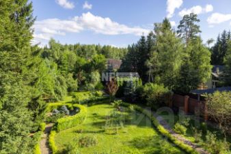 Выполнен профессиональный ландшафтный дизайн, на участке плодовые (груши, яблоки) и хвойные деревья, вековые сосны, розы, сирень. Рядом лес.