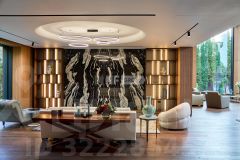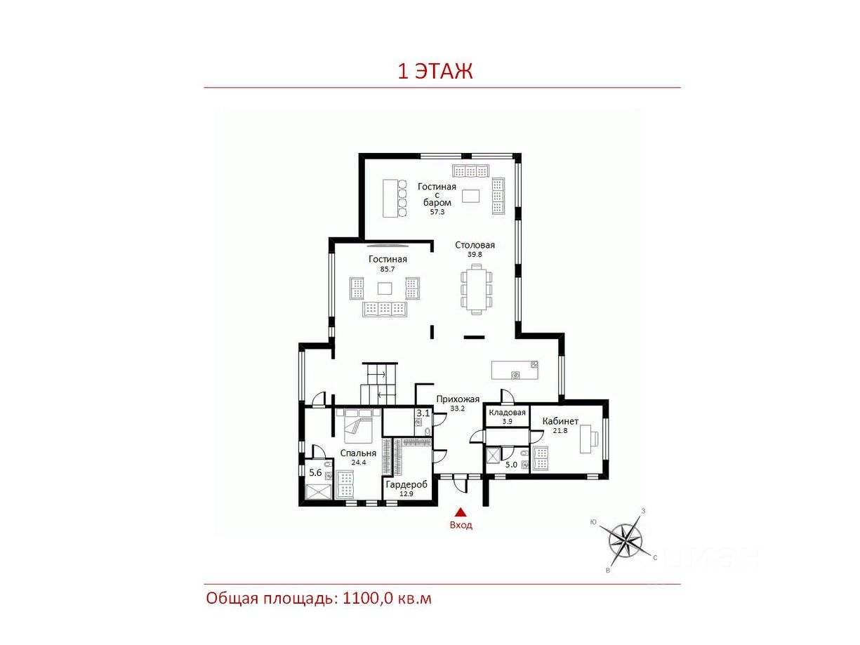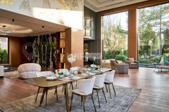 1 этаж: просторный холл, гардеробная, гостевой с/у, кухня, парадная столовая, гостиная, каминный зал, кабинет со своим с/у, гостевая спальня с с/у;