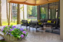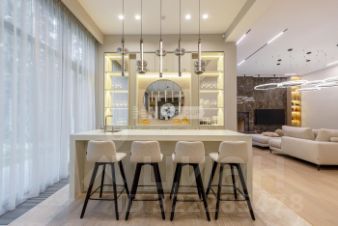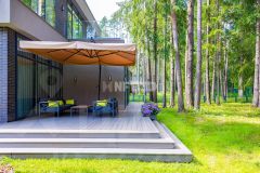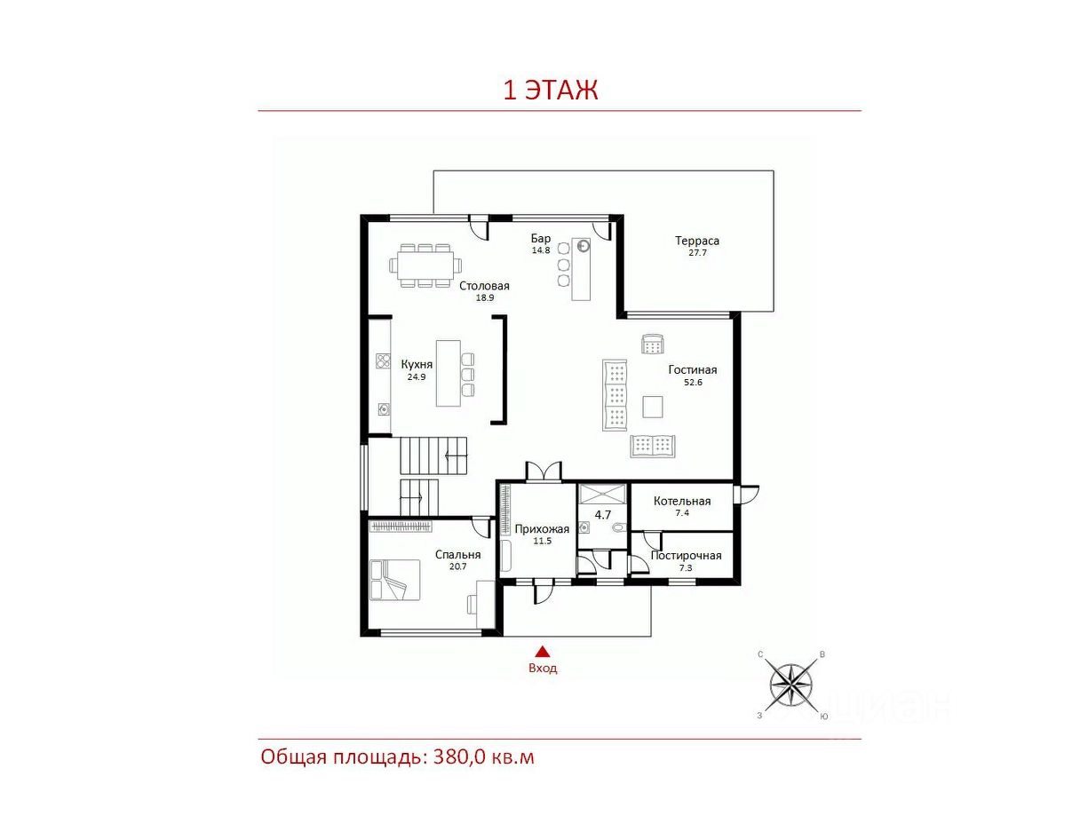 1 этаж: входной холл, просторная гостиная с большим открытым камином, спальня, профессионально укомплектованная кухня, столовая с барной стойкой и выходом на просторную террасу с лаунж- зоной, санузел, постирочная, котельная , спальня-кабинет, кухня с выходом на малую террасу и зону барбекю